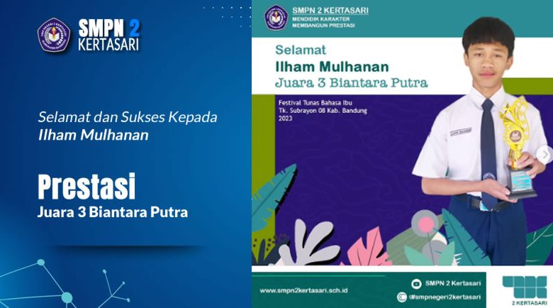 Selamat kepada Ilham Mulhanan kelas 9D yang telah menorehkan prestasi di bidang Seni dan Budaya. Juara 3 Biantara Putra Festivale Tuans Bahasa Ibu Tk. Subrayon 08 Kab. Bandung Tahun 2023.