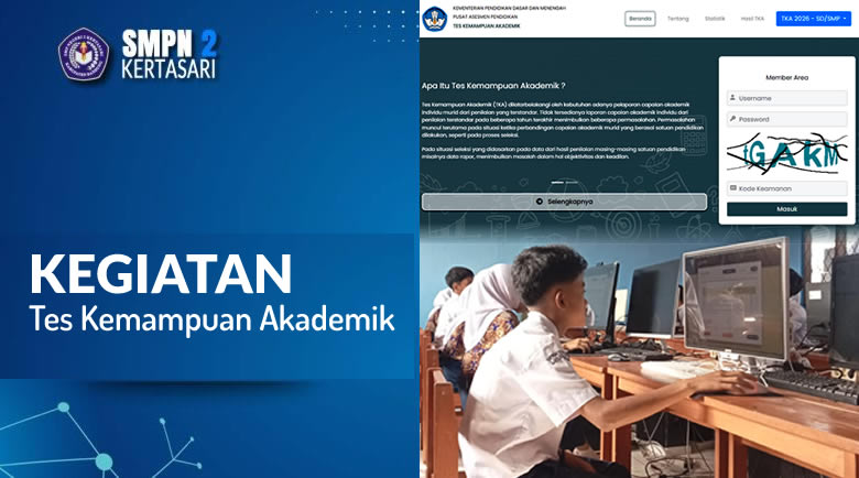 smpn2kertasari.sch.id. KEGIATAN SEKOLAH – SMPN 2 Kertasari melaksanakan Tes Kemampuan Akademik (TKA) Tahun 2026 dengan tertib dan lancar dalam dua gelombang. Gelombang 1 dilaksanakan pada tanggal 6 dan 7 April 2026, sedangkan Gelombang 2 berlangsung pada tanggal 8 dan 9 April 2026.